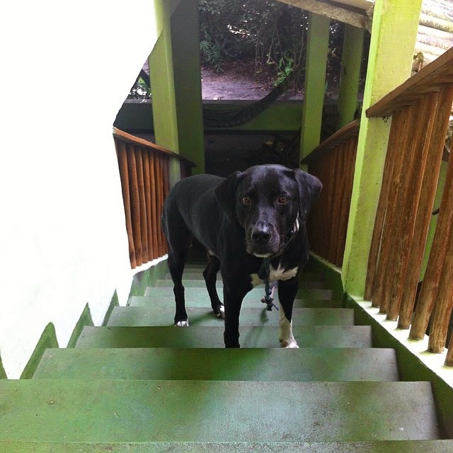 no primeiro jogo do Brasil, por exemplo, estávamos voltando da vila, e apareceu o cão, feliz de nos encontrar, batendo o rabo de forma giratória. ou, ontem, há mais de 3 km de casa, meio dormindo tomávamos sol na praia, quando Veneno apareceu uivando para o mar. feliz de estar conosco entrou no mar, nadou, caçou os pássaros que caçam animais na orla, bebeu água dentro de um coco, voltou conosco, sem se meter com nenhum dos pequenos cães que queriam provocá-lo. e não há nada que Veneno sinta mais ciúme do que de cachorrinhos.